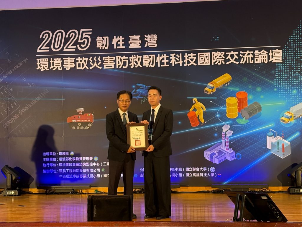 台半利澤廠工安室副理闕志衡(右)代表受領環境部「毒化物聯防組織運作績優獎」,由化學物質管理署長蔡孟裕(左)頒發